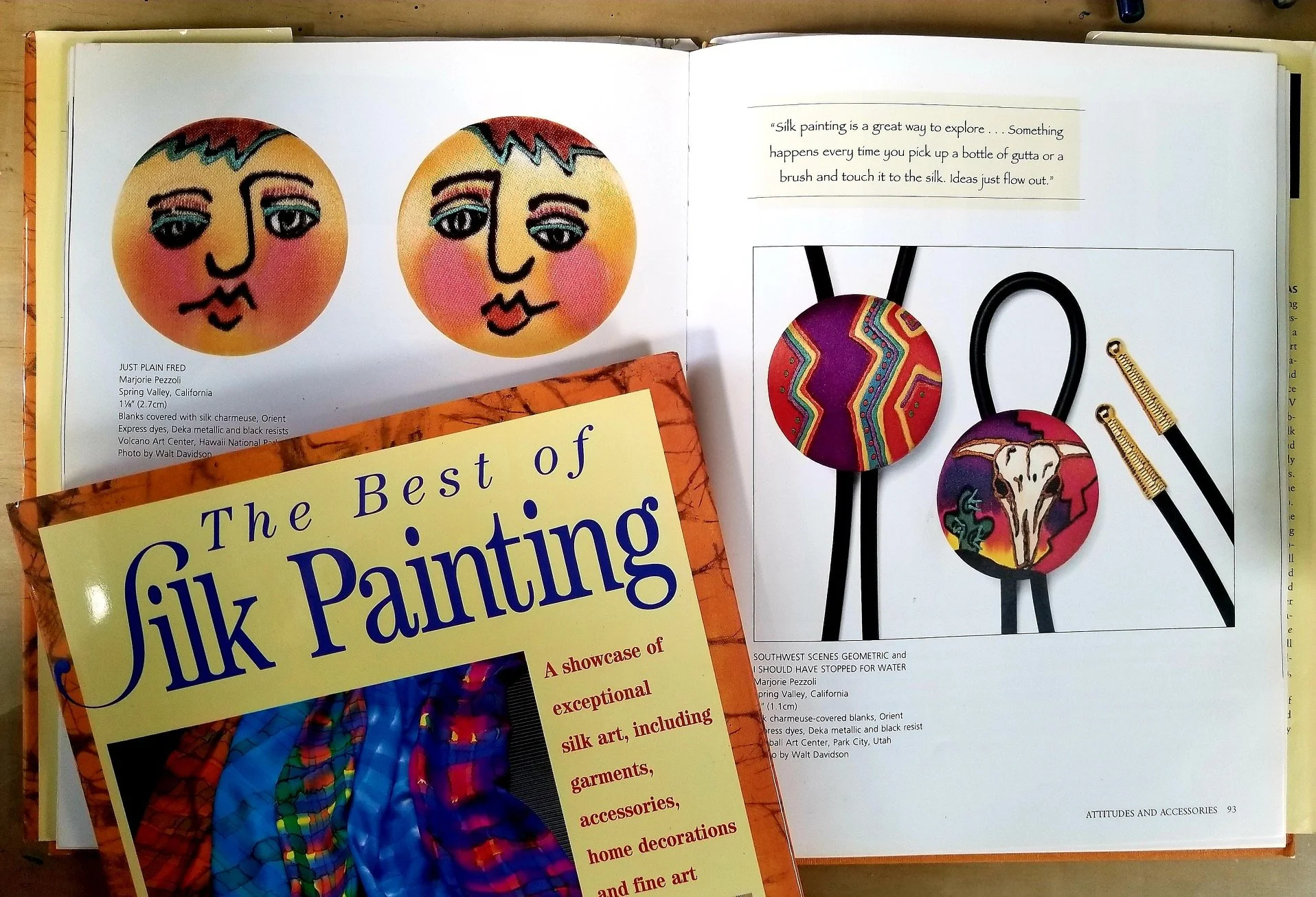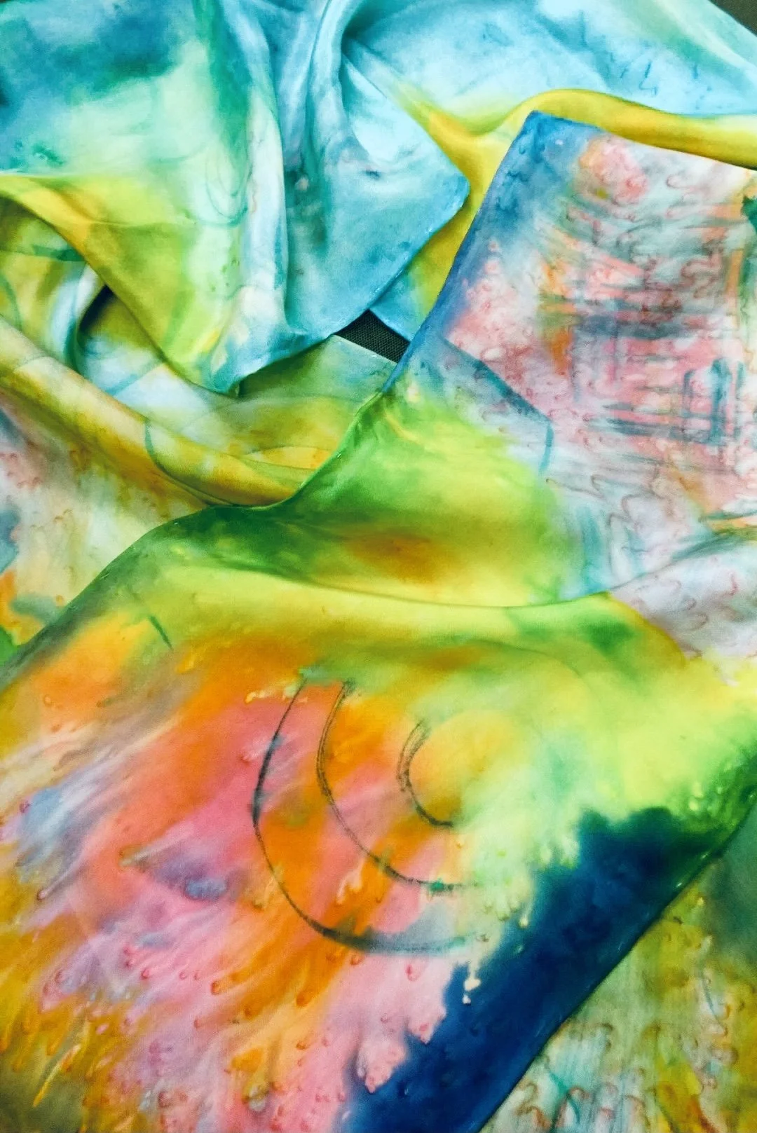 Marjorie Pezzoli captures colors in both silk and glass, along with creating poetry. Her work has been featured in "The Best of Silk Painting" and "The Fine Art of Painting on Silk" by Diane Tuckman and Jan Janus. She has been a member of the San Diego Silk Guild since 2010. Her silks have been in museum shops and boutiques over the years. She enjoys creating wearable art. Nature and the cosmos are major inspiration for Marjorie along with exploring color, textures, and patterns. The fluidity of time and space are recurring themes in all of her creative endeavors. Marjorie pairs writings with her paintings as a form of storytelling. She looks for words worth more than a 1000 images.